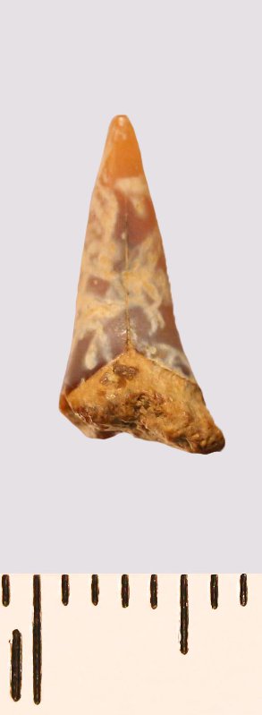 Зуб (фрагмент). Акула. Odontaspis striatula Dalinkevicius, 1935. Классификация: Хордовые Chordata, Позвоночные Vertebrata, Хрящевые рыбы Chondrichthyes, Пластиножаберные Elasmobranchii