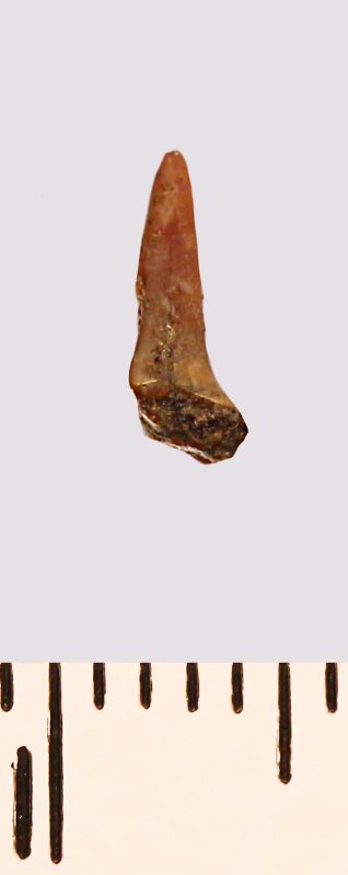 Зуб (фрагмент). Акула. Odontaspis striatula Dalinkevicius, 1935. Классификация: Хордовые Chordata, Позвоночные Vertebrata, Хрящевые рыбы Chondrichthyes, Пластиножаберные Elasmobranchii