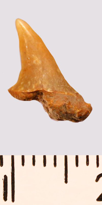 Зуб (фрагмент). Акула. Odontaspis striatula Dalinkevicius, 1935. Классификация: Хордовые Chordata, Позвоночные Vertebrata, Хрящевые рыбы Chondrichthyes, Пластиножаберные Elasmobranchii