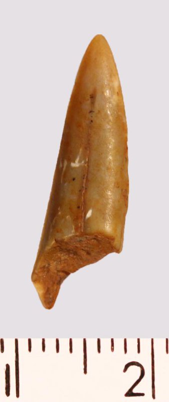 Зуб (фрагмент). Акула. Scapanorhynchus gigas Woodward 1889. Классификация: Хордовые Chordata, Позвоночные Vertebrata, Хрящевые рыбы Chondrichthyes, Пластиножаберные Elasmobranchii