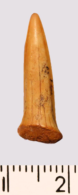 Зуб (фрагмент). Акула. Scapanorhynchus gigas Woodward 1889. Классификация: Хордовые Chordata, Позвоночные Vertebrata, Хрящевые рыбы Chondrichthyes, Пластиножаберные Elasmobranchii