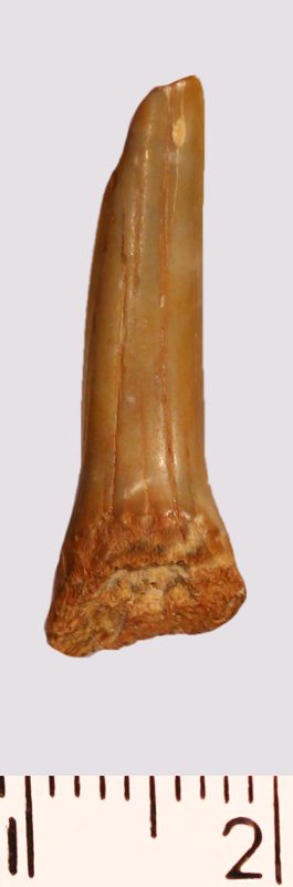 Зуб (фрагмент). Акула. Scapanorhynchus gigas Woodward 1889. Классификация: Хордовые Chordata, Позвоночные Vertebrata, Хрящевые рыбы Chondrichthyes, Пластиножаберные Elasmobranchii