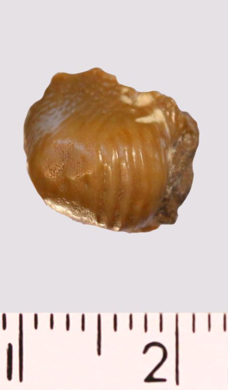 Зуб (фрагмент). Акула. Ptychodus rugosus Dixon, 1850. Классификация: Хордовые Chordata, Позвоночные Vertebrata, Хрящевые рыбы Chondrichthyes, Пластиножаберные Elasmobranchii