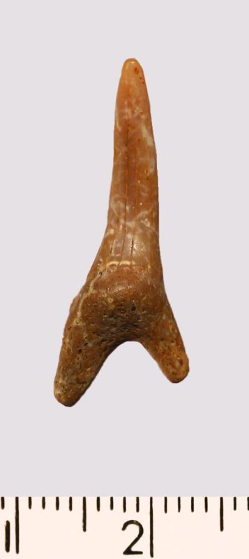 Зуб. Акула. Scapanorhynchus gigas Woodward 1889. Классификация: Хордовые Chordata, Позвоночные Vertebrata, Хрящевые рыбы Chondrichthyes, Пластиножаберные Elasmobranchii