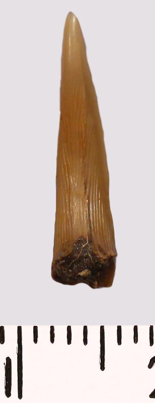 Зуб (фрагмент). Акула. Scapanorhynchus raphiodon (Agassiz, 1843). Классификация: Хордовые Chordata, Позвоночные Vertebrata, Хрящевые рыбы Chondrichthyes, Пластиножаберные Elasmobranchii