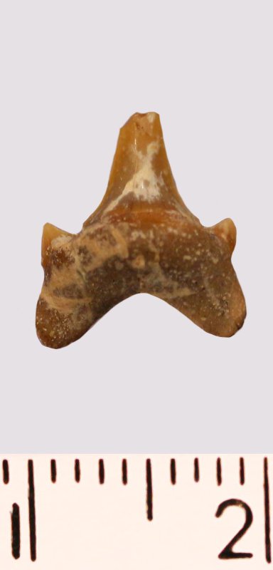 Зуб. Акула. Odontaspis macrorhiza (Cope) Leriche, 1902. Классификация: Хордовые Chordata, Позвоночные Vertebrata, Хрящевые рыбы Chondrichthyes, Пластиножаберные Elasmobranchii
