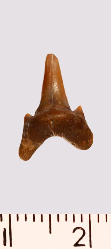 Зуб. Акула. Odontaspis macrorhiza (Cope) Leriche, 1902. Классификация: Хордовые Chordata, Позвоночные Vertebrata, Хрящевые рыбы Chondrichthyes, Пластиножаберные Elasmobranchii