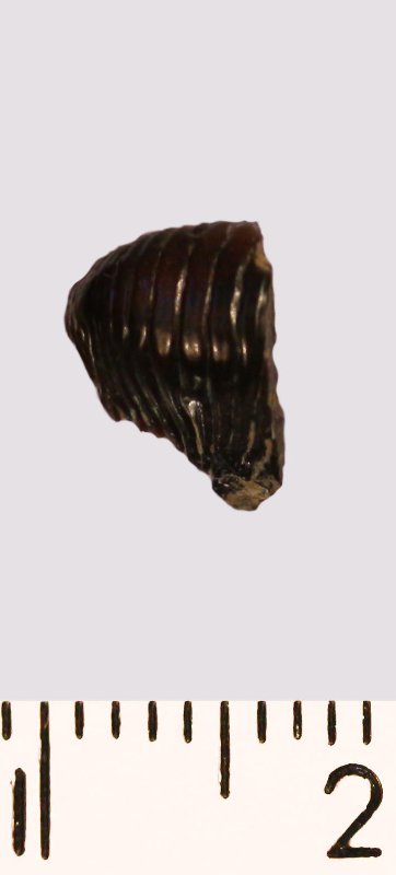 Зуб (фрагмент). Акула. Ptychodus decurrens Agassiz, 1839. Классификация: Хордовые Chordata, Позвоночные Vertebrata, Хрящевые рыбы Chondrichthyes, Пластиножаберные Elasmobranchii