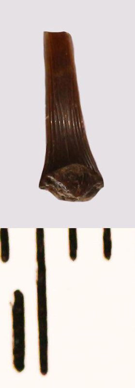Зуб (фрагмент). Акула. Odontaspis aff. subulata (Agassiz, 1843). Классификация: Хордовые Chordata, Позвоночные Vertebrata, Хрящевые рыбы Chondrichthyes, Пластиножаберные Elasmobranchii