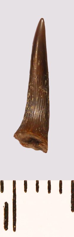 Зуб (фрагмент). Акула. Scapanorhynchus raphiodon (Agassiz, 1843). Классификация: Хордовые Chordata, Позвоночные Vertebrata, Хрящевые рыбы Chondrichthyes, Пластиножаберные Elasmobranchii