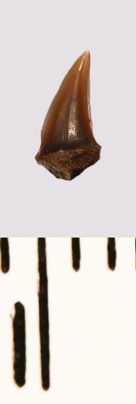 Зуб (фрагмент). Акула. Odontaspis aff. subulata (Agassiz, 1843). Классификация: Хордовые Chordata, Позвоночные Vertebrata, Хрящевые рыбы Chondrichthyes, Пластиножаберные Elasmobranchii