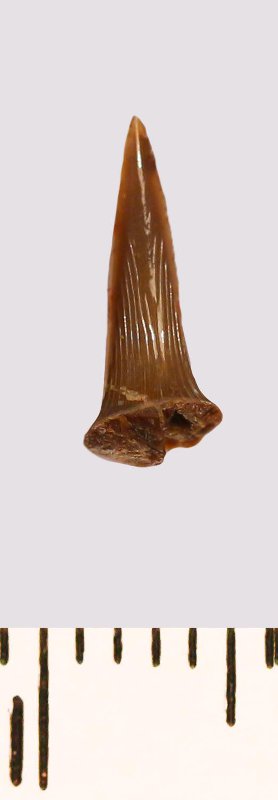 Зуб (фрагмент). Акула. Scapanorhynchus raphiodon (Agassiz, 1843). Классификация: Хордовые Chordata, Позвоночные Vertebrata, Хрящевые рыбы Chondrichthyes, Пластиножаберные Elasmobranchii