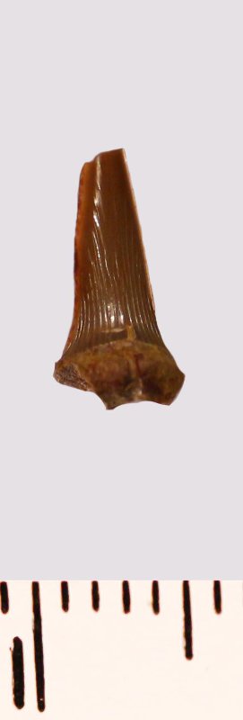 Зуб (фрагмент). Акула. Scapanorhynchus raphiodon (Agassiz, 1843). Классификация: Хордовые Chordata, Позвоночные Vertebrata, Хрящевые рыбы Chondrichthyes, Пластиножаберные Elasmobranchii