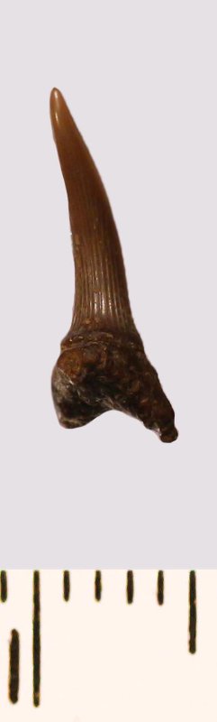 Зуб. Акула. Scapanorhynchus raphiodon (Agassiz, 1843). Классификация: Хордовые Chordata, Позвоночные Vertebrata, Хрящевые рыбы Chondrichthyes, Пластиножаберные Elasmobranchii