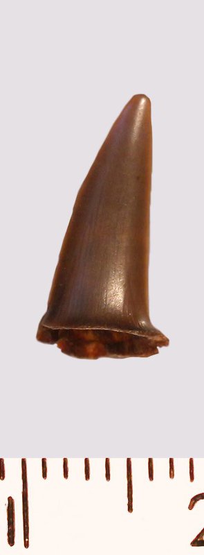 Зуб (фрагмент). Акула. Scapanorhynchus gigas Woodward 1889. Классификация: Хордовые Chordata, Позвоночные Vertebrata, Хрящевые рыбы Chondrichthyes, Пластиножаберные Elasmobranchii