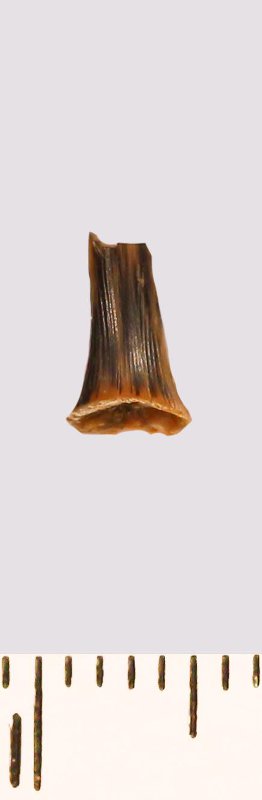Зуб (фрагмент). Акула. Scapanorhynchus raphiodon (Agassiz, 1843). Классификация: Хордовые Chordata, Позвоночные Vertebrata, Хрящевые рыбы Chondrichthyes, Пластиножаберные Elasmobranchii