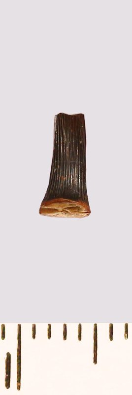 Зуб (фрагмент). Акула. Scapanorhynchus raphiodon (Agassiz, 1843). Классификация: Хордовые Chordata, Позвоночные Vertebrata, Хрящевые рыбы Chondrichthyes, Пластиножаберные Elasmobranchii