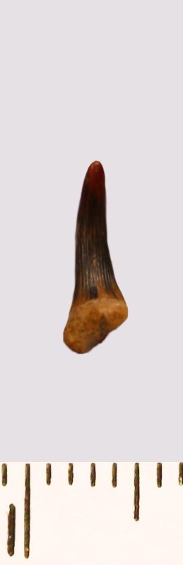 Зуб (фрагмент). Акула. Scapanorhynchus raphiodon (Agassiz, 1843). Классификация: Хордовые Chordata, Позвоночные Vertebrata, Хрящевые рыбы Chondrichthyes, Пластиножаберные Elasmobranchii