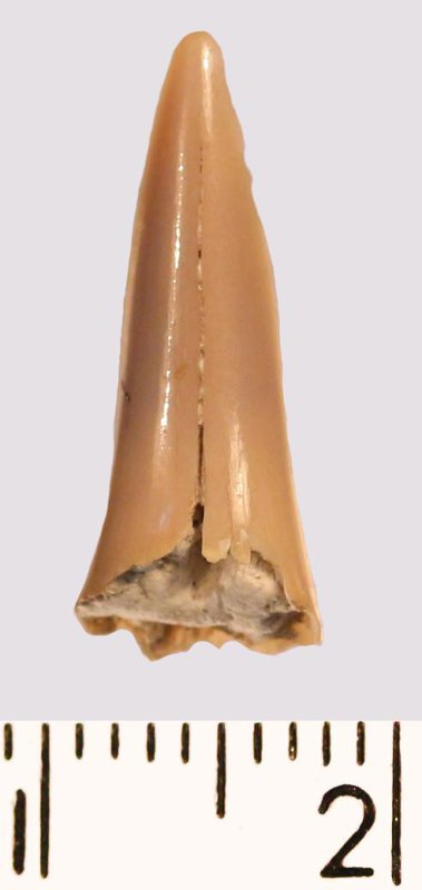 Зуб (фрагмент). Акула. Cretolamna appendiculata (Agassiz, 1843). Классификация: Хордовые Chordata, Позвоночные Vertebrata, Хрящевые рыбы Chondrichthyes, Пластиножаберные Elasmobranchii