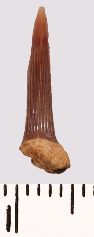 Зуб (фрагмент). Акула. Scapanorhynchus sp. Классификация: Хордовые Chordata, Позвоночные Vertebrata, Хрящевые рыбы Chondrichthyes, Пластиножаберные Elasmobranchii
