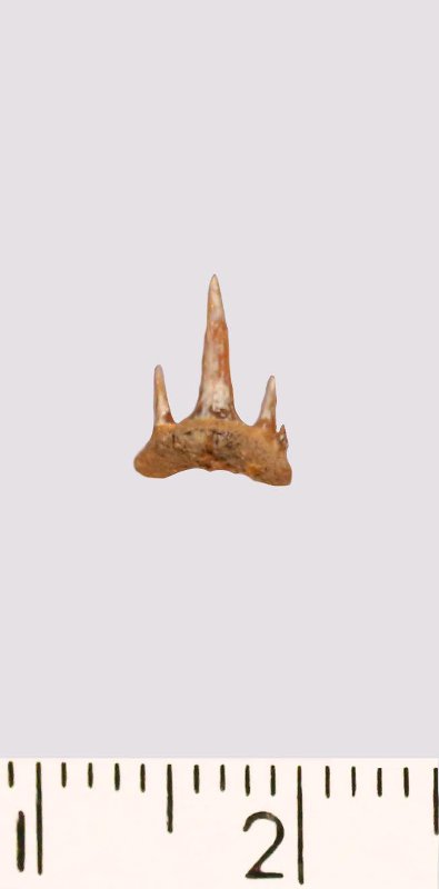 Зуб. Акула. Scapanorhynchus sp. Классификация: Хордовые Chordata, Позвоночные Vertebrata, Хрящевые рыбы Chondrichthyes, Пластиножаберные Elasmobranchii