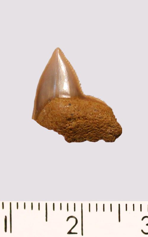Зуб. Акула. Squalicorax falcatus (Agassiz, 1843). Классификация: Хордовые Chordata, Позвоночные Vertebrata, Хрящевые рыбы Chondrichthyes, Пластиножаберные Elasmobranchii
