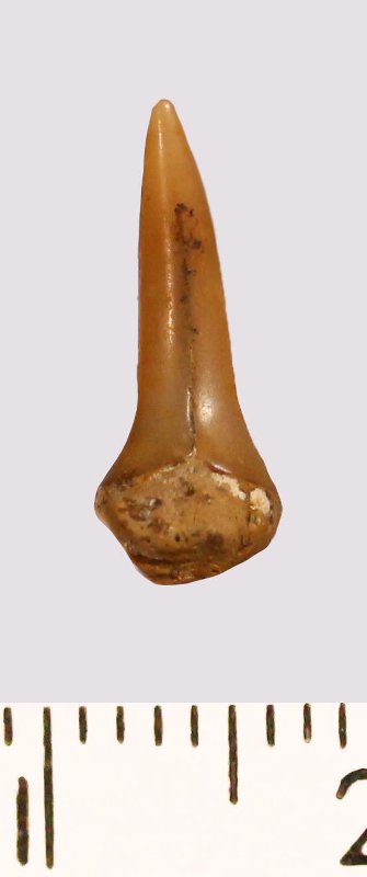 Зуб (фрагмент). Акула. Lamniformes gen. et sp. indet. Классификация: Хордовые Chordata, Позвоночные Vertebrata, Хрящевые рыбы Chondrichthyes, Пластиножаберные Elasmobranchii