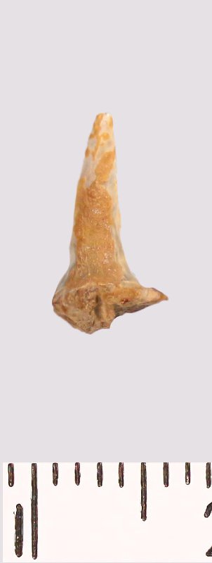 Зуб (фрагмент). Акула. Scapanorhynchus raphiodon (Agassiz, 1843). Классификация: Хордовые Chordata, Позвоночные Vertebrata, Хрящевые рыбы Chondrichthyes, Пластиножаберные Elasmobranchii