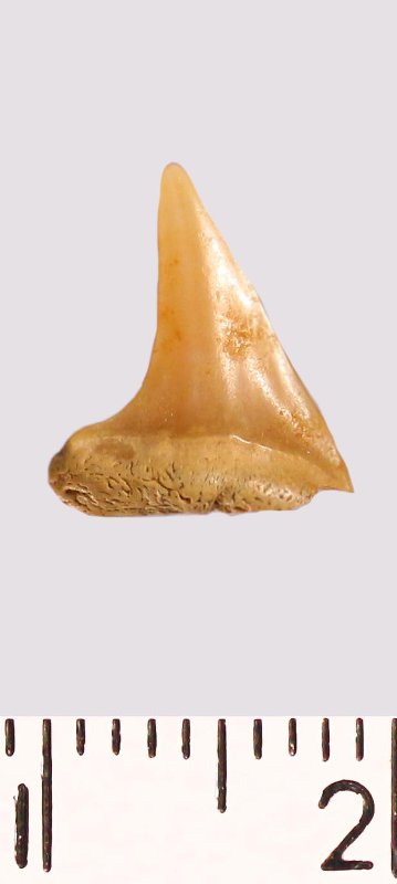 Зуб (фрагмент). Акула. Odontaspis venusta (Leriche, 1929). Классификация: Хордовые Chordata, Позвоночные Vertebrata, Хрящевые рыбы Chondrichthyes, Пластиножаберные Elasmobranchii
