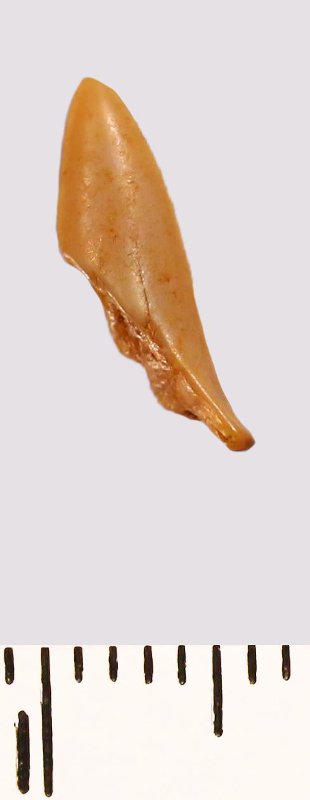 Зуб (фрагмент). Акула. Scapanorhynchus gigas Woodward 1889. Классификация: Хордовые Chordata, Позвоночные Vertebrata, Хрящевые рыбы Chondrichthyes, Пластиножаберные Elasmobranchii