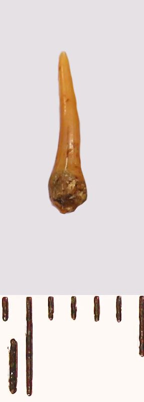 Зуб (фрагмент). Акула. Scapanorhynchus sp. Классификация: Хордовые Chordata, Позвоночные Vertebrata, Хрящевые рыбы Chondrichthyes, Пластиножаберные Elasmobranchii