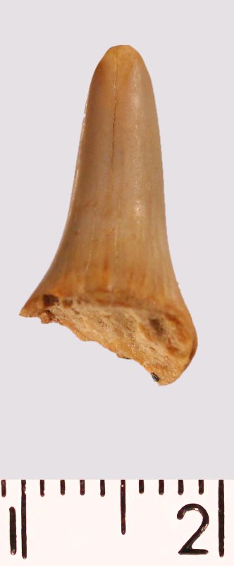 Зуб (фрагмент). Акула. Lamna cf. semiplicata (Agassiz, 1843). Классификация: Хордовые Chordata, Позвоночные Vertebrata, Хрящевые рыбы Chondrichthyes, Пластиножаберные Elasmobranchii