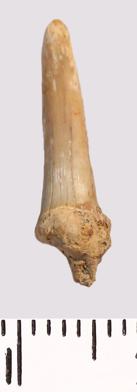 Зуб (фрагмент). Акула. Scapanorhynchus rapax Quaas, 1902. Классификация: Хордовые Chordata, Позвоночные Vertebrata, Хрящевые рыбы Chondrichthyes, Пластиножаберные Elasmobranchii