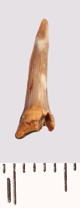 Зуб (фрагмент). Акула. Scapanorhynchus raphiodon (Agassiz, 1843). Классификация: Хордовые Chordata, Позвоночные Vertebrata, Хрящевые рыбы Chondrichthyes, Пластиножаберные Elasmobranchii