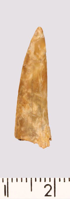 Зуб (фрагмент). Акула. Scapanorhynchus gigas Woodward 1889. Классификация: Хордовые Chordata, Позвоночные Vertebrata, Хрящевые рыбы Chondrichthyes, Пластиножаберные Elasmobranchii