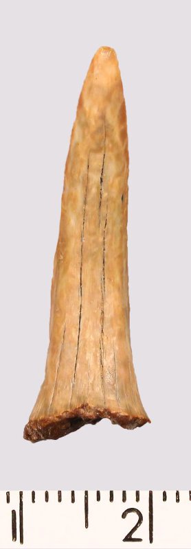 Зуб (фрагмент). Акула. Scapanorhynchus gigas Woodward 1889. Классификация: Хордовые Chordata, Позвоночные Vertebrata, Хрящевые рыбы Chondrichthyes, Пластиножаберные Elasmobranchii