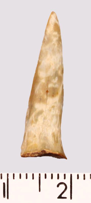 Зуб (фрагмент). Акула. Scapanorhynchus gigas Woodward 1889. Классификация: Хордовые Chordata, Позвоночные Vertebrata, Хрящевые рыбы Chondrichthyes, Пластиножаберные Elasmobranchii