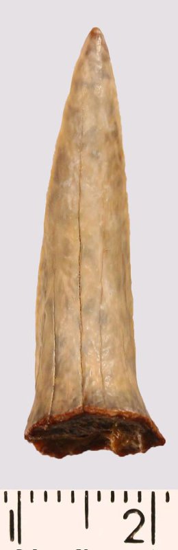Зуб (фрагмент). Акула. Scapanorhynchus gigas Woodward 1889. Классификация: Хордовые Chordata, Позвоночные Vertebrata, Хрящевые рыбы Chondrichthyes, Пластиножаберные Elasmobranchii