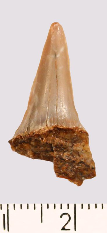 Зуб (фрагмент). Акула. Otodus semiplicatus Agassiz, 1843. Классификация: Хордовые Chordata, Позвоночные Vertebrata, Хрящевые рыбы Chondrichthyes, Пластиножаберные Elasmobranchii