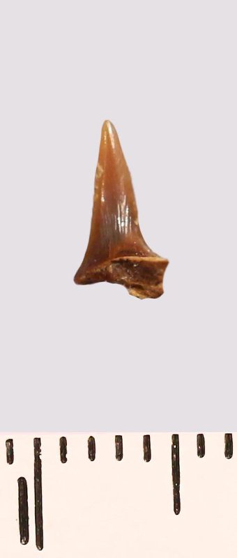 Зуб (фрагмент). Акула. Odontaspis ex gr. subulata (Agassiz, 1843). Классификация: Хордовые Chordata, Позвоночные Vertebrata, Хрящевые рыбы Chondrichthyes, Пластиножаберные Elasmobranchii