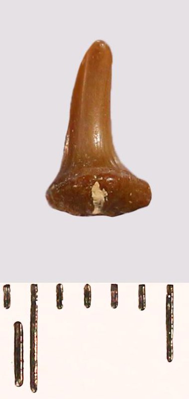 Зуб (фрагмент). Акула. Odontaspis ex gr. subulata (Agassiz, 1843). Классификация: Хордовые Chordata, Позвоночные Vertebrata, Хрящевые рыбы Chondrichthyes, Пластиножаберные Elasmobranchii