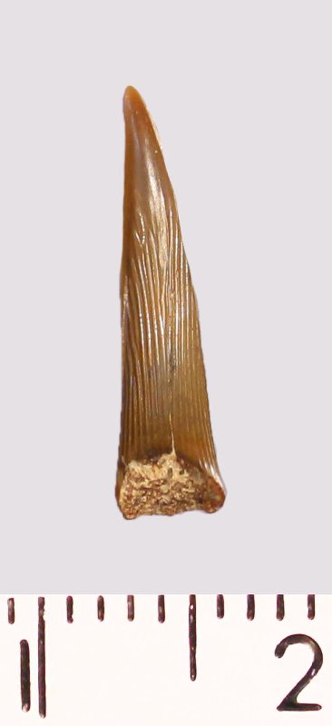 Зуб (фрагмент). Акула. Scapanorhynchus raphiodon (Agassiz, 1843). Классификация: Хордовые Chordata, Позвоночные Vertebrata, Хрящевые рыбы Chondrichthyes, Пластиножаберные Elasmobranchii