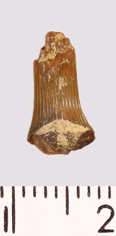 Зуб (фрагмент). Акула. Scapanorhynchus raphiodon (Agassiz, 1843). Классификация: Хордовые Chordata, Позвоночные Vertebrata, Хрящевые рыбы Chondrichthyes, Пластиножаберные Elasmobranchii