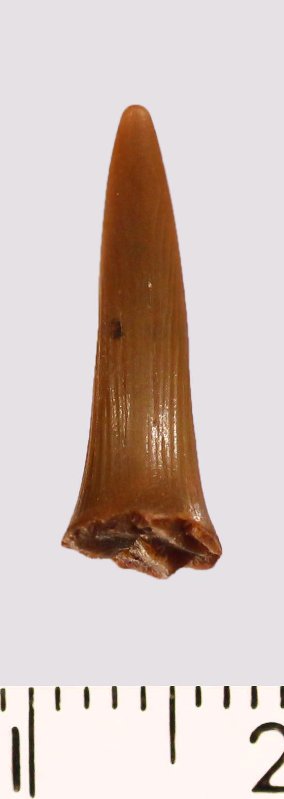 Зуб (фрагмент). Акула. Scapanorhynchus raphiodon (Agassiz, 1843). Классификация: Хордовые Chordata, Позвоночные Vertebrata, Хрящевые рыбы Chondrichthyes, Пластиножаберные Elasmobranchii