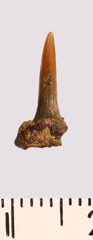 Зуб (фрагмент). Акула. Scapanorhynchus raphiodon (Agassiz, 1843). Классификация: Хордовые Chordata, Позвоночные Vertebrata, Хрящевые рыбы Chondrichthyes, Пластиножаберные Elasmobranchii
