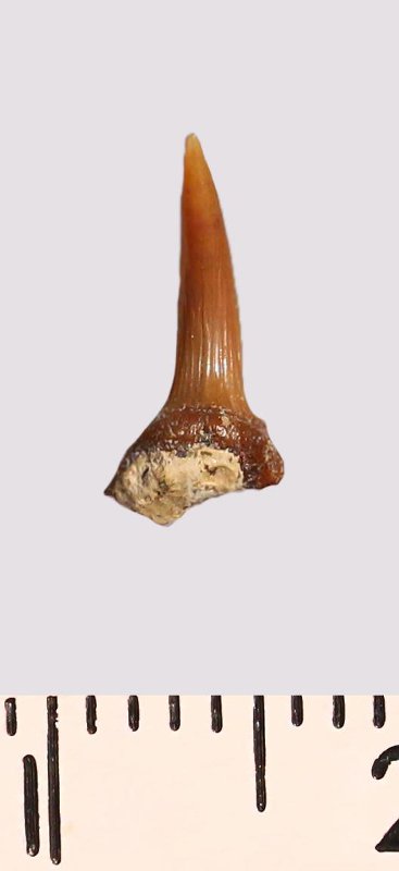 Зуб (фрагмент). Акула. Scapanorhynchus raphiodon (Agassiz, 1843). Классификация: Хордовые Chordata, Позвоночные Vertebrata, Хрящевые рыбы Chondrichthyes, Пластиножаберные Elasmobranchii