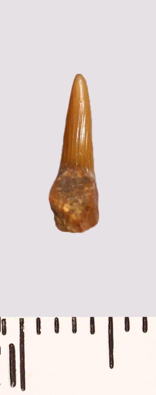 Зуб (фрагмент). Акула. Scapanorhynchus raphiodon (Agassiz, 1843). Классификация: Хордовые Chordata, Позвоночные Vertebrata, Хрящевые рыбы Chondrichthyes, Пластиножаберные Elasmobranchii