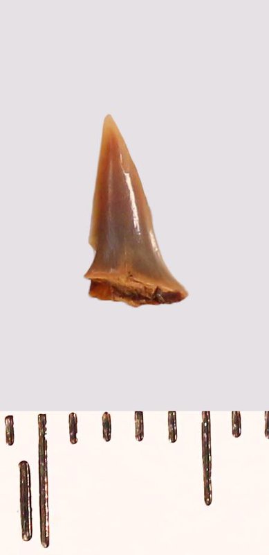 Зуб (фрагмент). Акула. Odontaspis ex gr. subulata (Agassiz, 1843). Классификация: Хордовые Chordata, Позвоночные Vertebrata, Хрящевые рыбы Chondrichthyes, Пластиножаберные Elasmobranchii