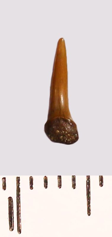 Зуб (фрагмент). Акула. Odontaspis ex gr. subulata (Agassiz, 1843). Классификация: Хордовые Chordata, Позвоночные Vertebrata, Хрящевые рыбы Chondrichthyes, Пластиножаберные Elasmobranchii