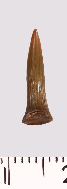 Зуб (фрагмент). Акула. Scapanorhynchus raphiodon (Agassiz, 1843). Классификация: Хордовые Chordata, Позвоночные Vertebrata, Хрящевые рыбы Chondrichthyes, Пластиножаберные Elasmobranchii